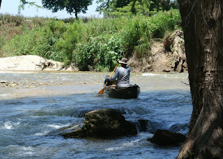 About two miles downstream of the Park, we arrived at the top of Thompson's Island. We chose not to run Cape Falls, which leads to the main channel of the river on the right side of the island, as we had been advised that there was a large downed tree blocking that channel. As we stayed left, we spotted this Yellow-crowned Night Heron on the left bank. She wasn't particularly happy to see us, but didn't take flight, either. From there, it was only a few hundred yards along the left channel, an old mill race, to our take-out at Cape Road. Once there, Sally drove me back to City Park to pick up the van and trailer. Soon the kids were headed back north to Austin and Kathy and I were on our way south to San Antonio. It had been a great Father's Day.